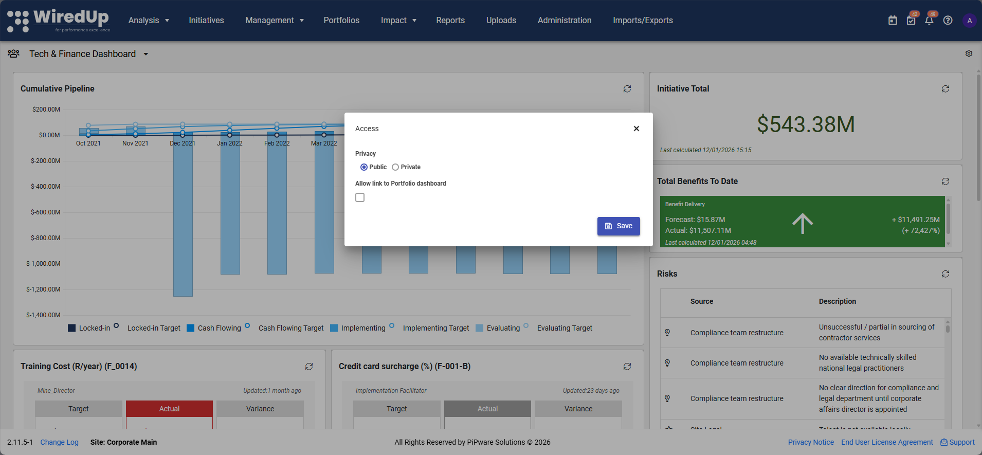 Dashboards are your central hub for viewing key information in WiredUp. Upon logging in, you will land on your default dashboard if one has been selected. If no default dashboard has been selected, the dashboard screen will appear empty with the option to add a dashboard to your screen. Dashboards use customizable widgets to display both user-specific and general information, which can be filtered by organizational structure, date, and other metadata. You can access multiple dashboards, favorite the ones you use most, create personal dashboards for private use, or share public dashboards with your team. Dashboard owners have full control to customize layouts, add widgets, and manage access permissions.