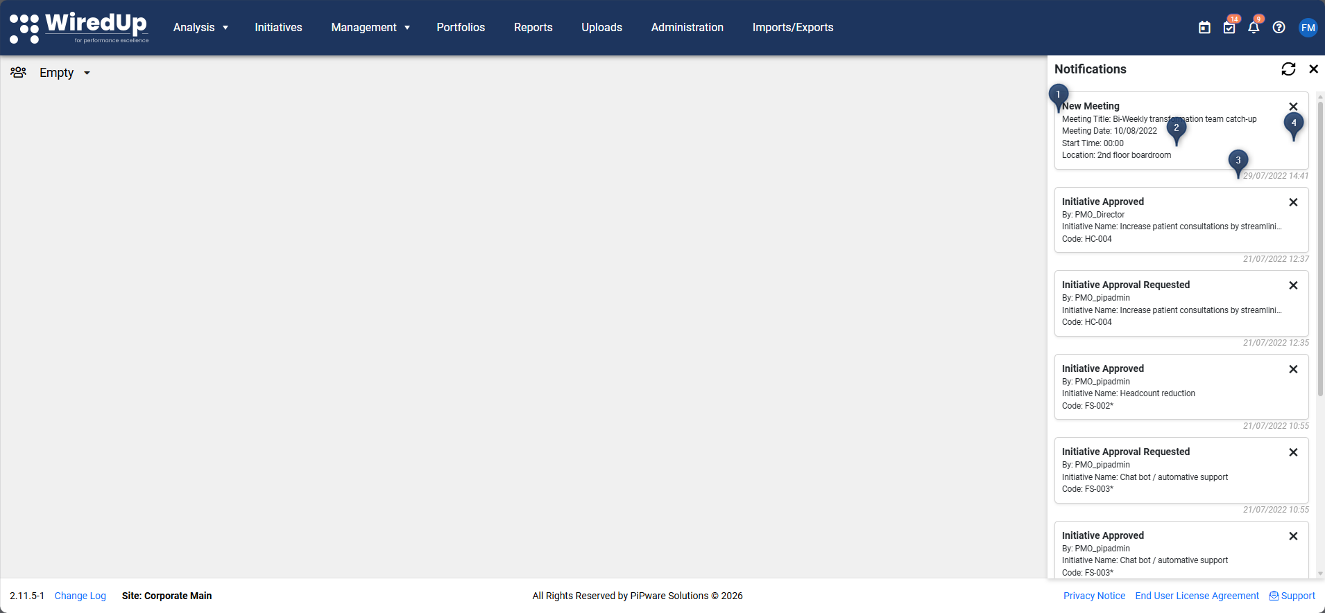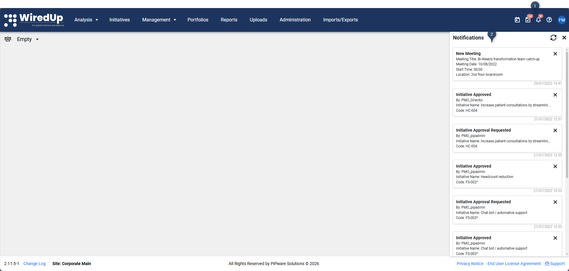 My Notifications is a built-in alert system that keeps you informed about important changes and updates in WiredUp. The system automatically sends notifications when, for examples, activities, meetings, and ideas that you own or are associated with are modified. You'll also receive notifications when specific actions, such as data exports or imports, are completed. This ensures you stay up-to-date with all relevant changes without having to manually check for updates.