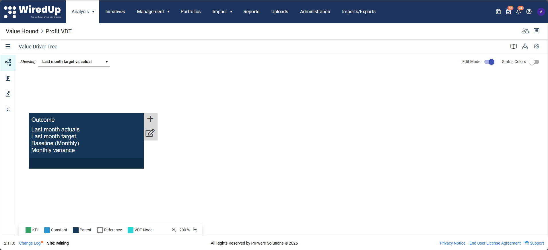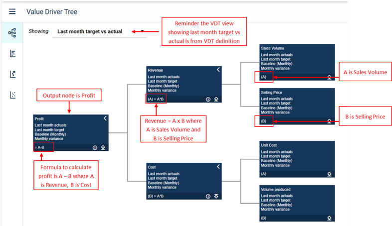 The view shown at the top (for example, "Last month target vs actual") and the fields displayed on each node (such as Last month actuals, Last month target, Baseline (Monthly), and Monthly variance) come from your Value Driver Tree definition.