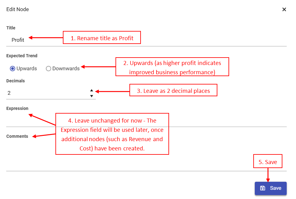 Configure the outcome node with the name "Profit" and set the appropriate expected trend and decimals.
