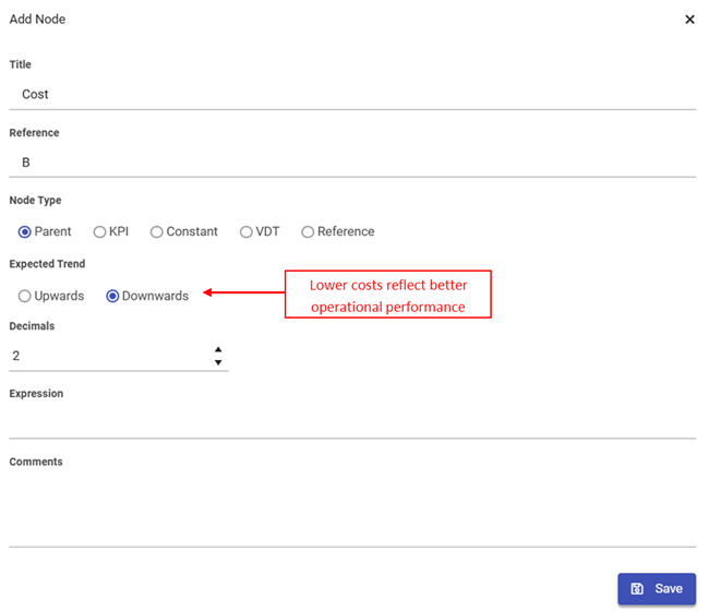 - Comments: Optional notes to describe assumptions, logic, or context for the node