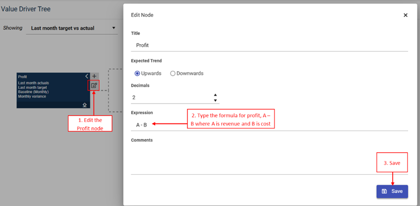 - Select edit on the profit VDT box, type expression as A – B. This makes the VDT mathematical logic work.