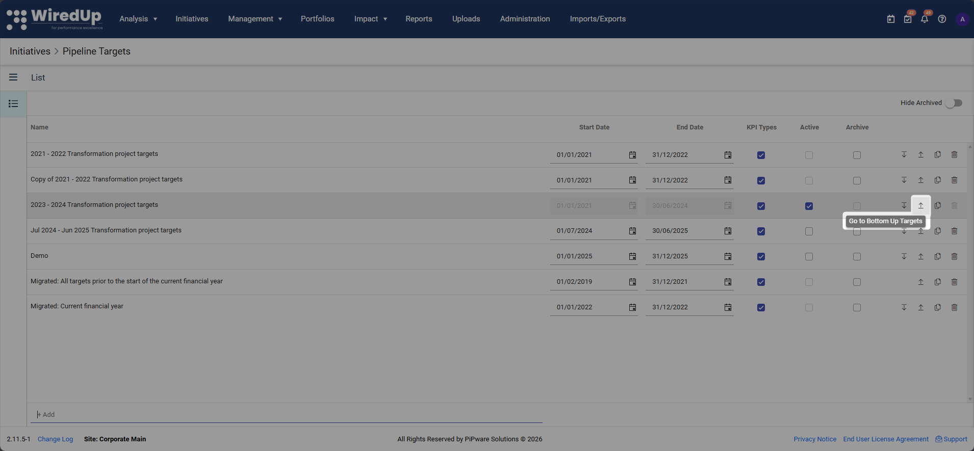 3. On the pipeline targets page, locate and click the Bottom-up icon for the desired pipeline target to access the Bottom-up target setting detail page
