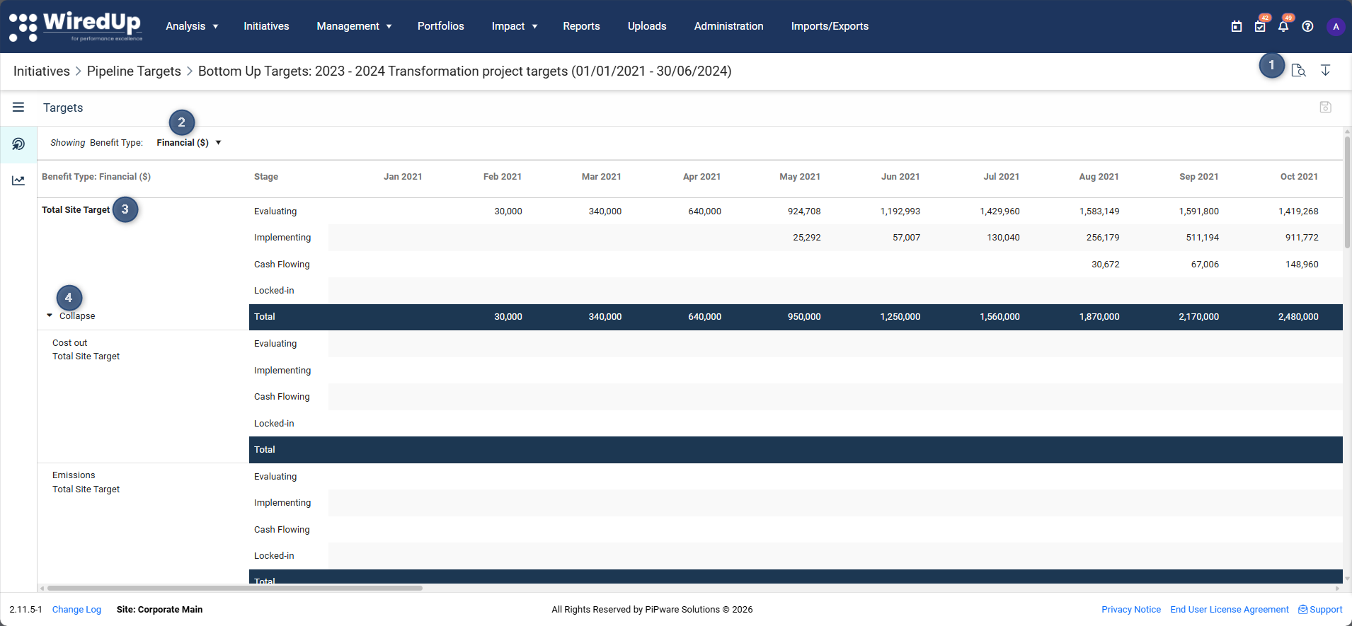 3. View the aggregated, view-only total site target values. The target values entered at a granular level are aggregated to display the total site target values.