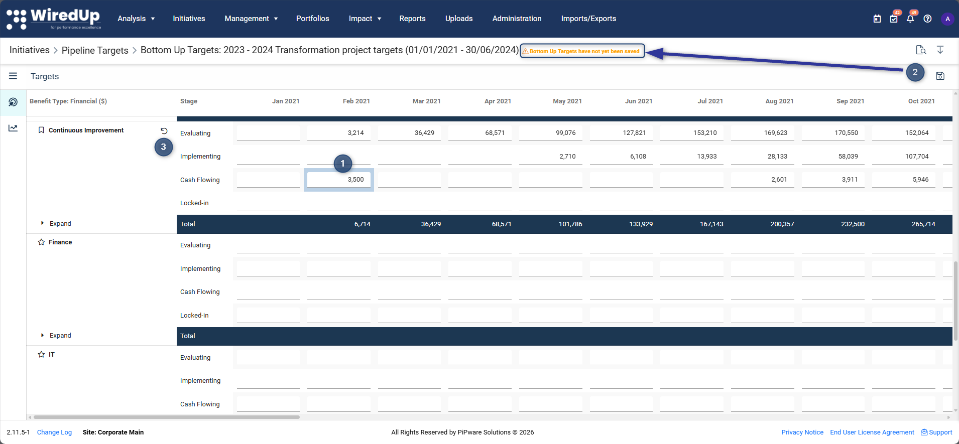 Bottom-up target adjustments enable users to define specific targets within an organisational hierarchy level and timeframe. This adds granularity to Top-down targets and improves the accuracy of the overall target set. After setting Top-down targets, target values are auto-populated across each hierarchy level and month. Users can drill down into each level and edit as required. This approach allows for precise adjustments at any organizational level, ensuring that targets reflect the reality of each department or unit while maintaining alignment with overall organizational goals.