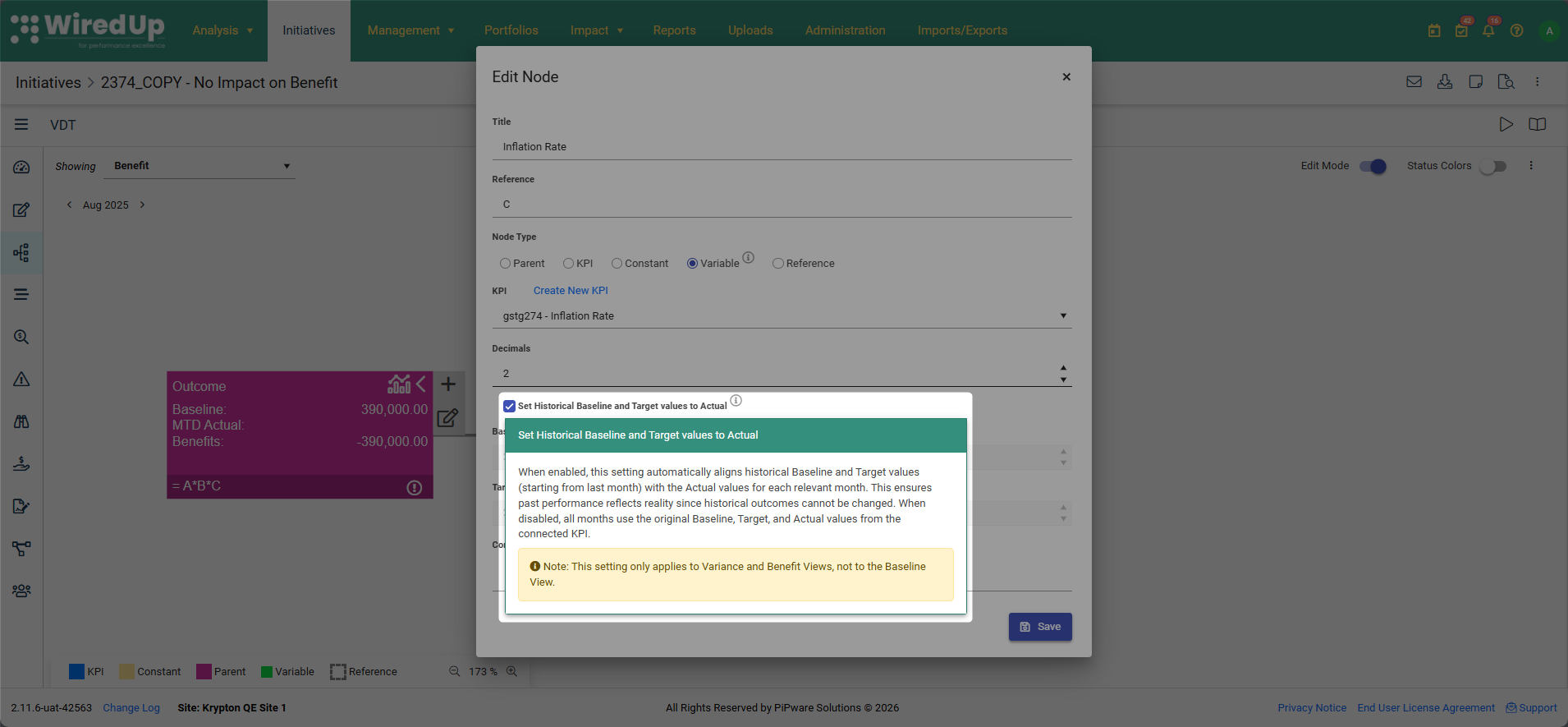 For Variable nodes, you can now control whether historical values should align with Actual values (No Impact on Benefit) or use the original default values from the connected KPI. This is managed through a configurable checkbox setting.