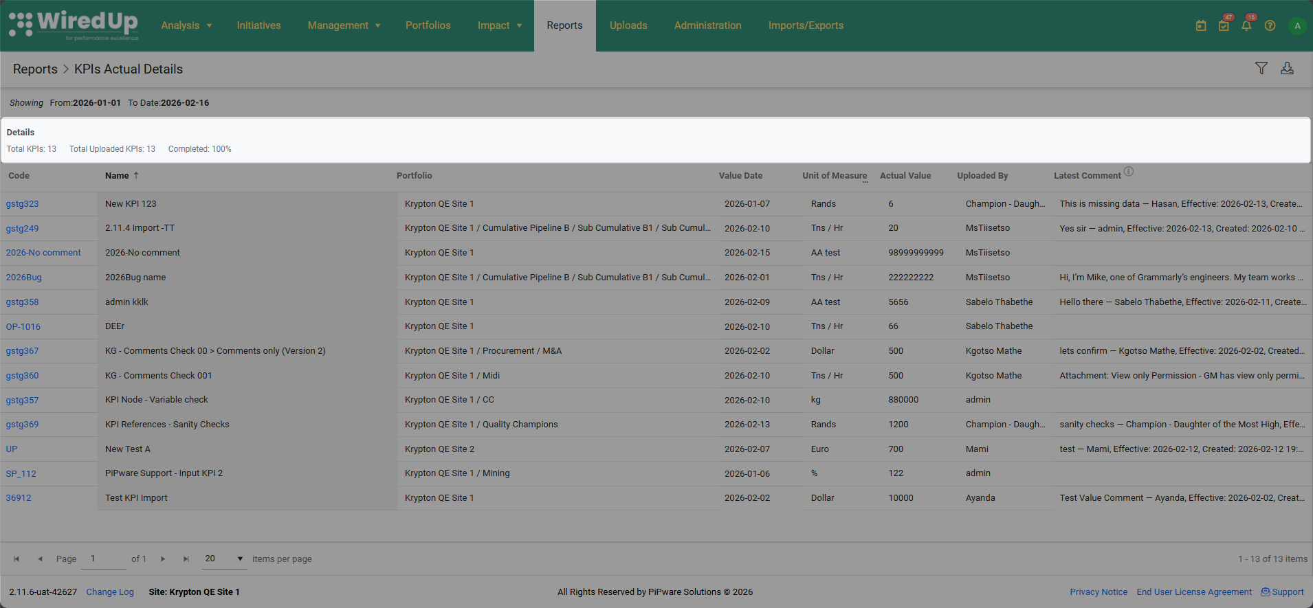 The KPI Actual Details report provides a comprehensive list of all KPIs in the system along with their most recent actual values and associated details. This report helps users track and monitor KPI performance by displaying the latest captured actual values, who uploaded them, and when they were recorded. The report is particularly useful for auditing data entry, verifying KPI updates, and ensuring data quality across the organization.