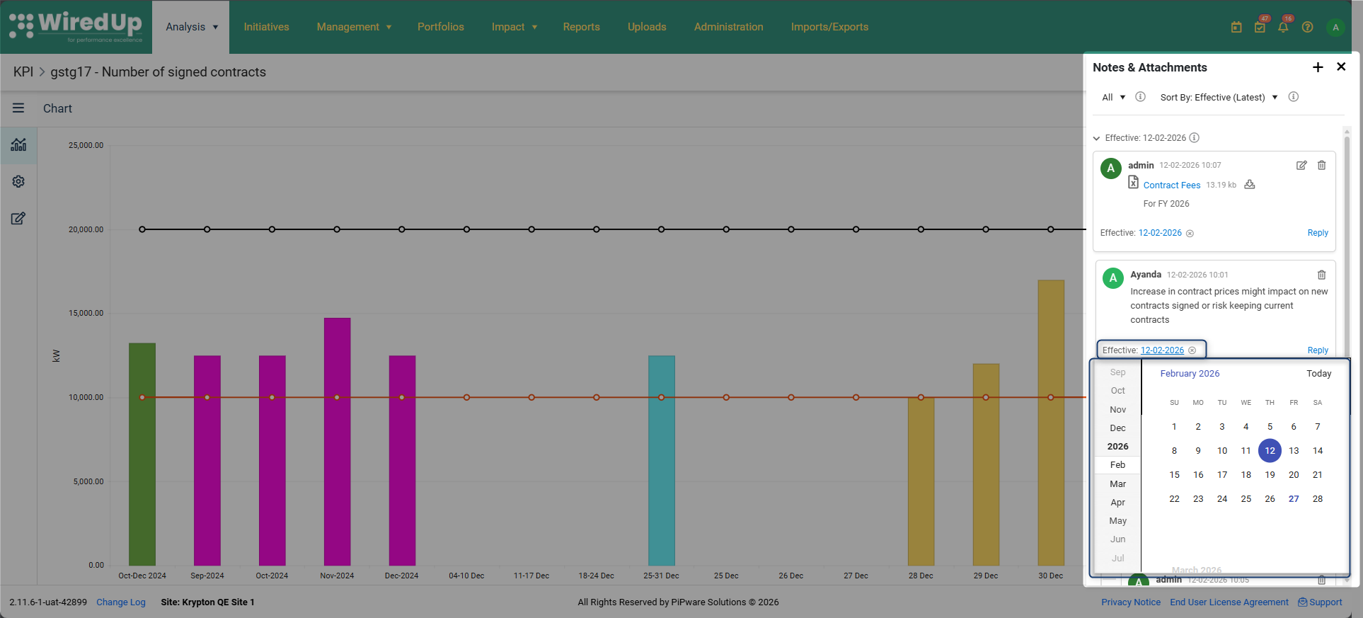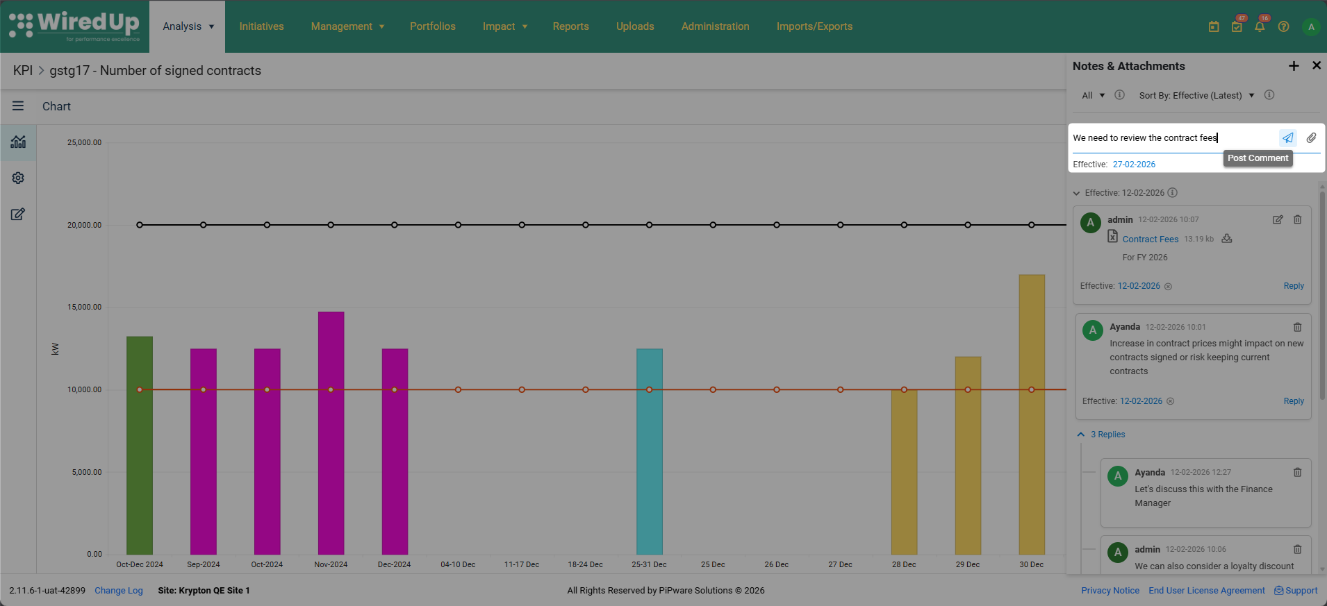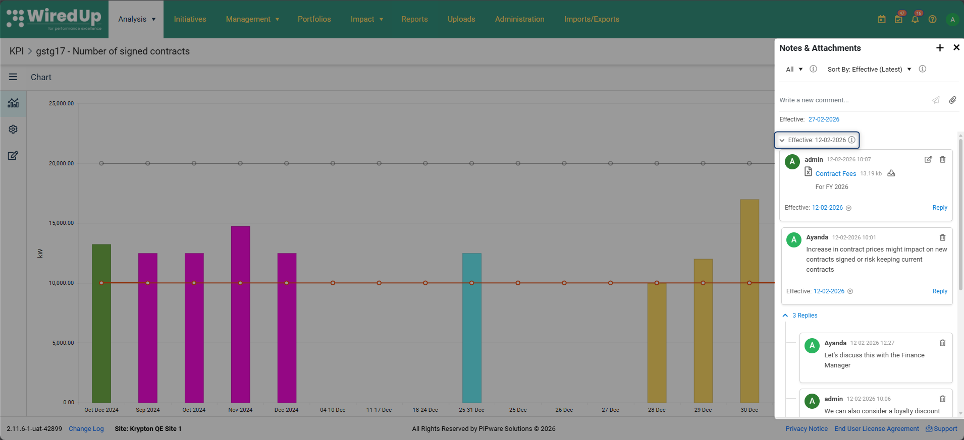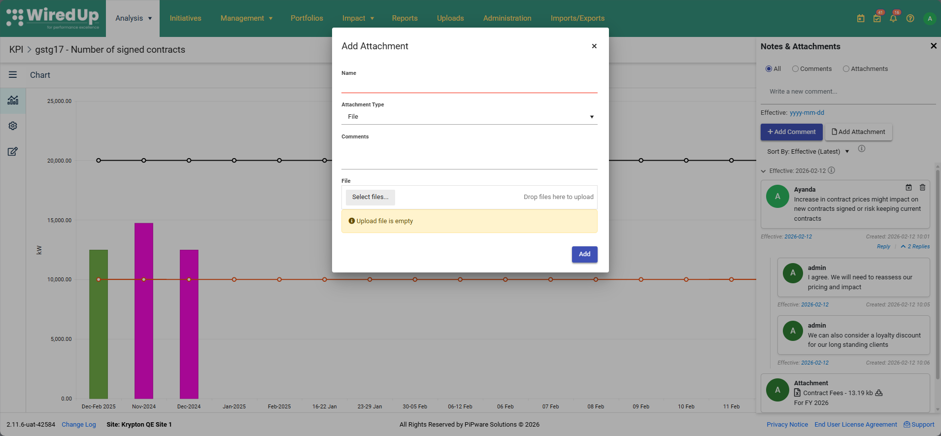 El módulo KPI ahora incluye una función de notas y archivos adjuntos que permite a los usuarios añadir comentarios y archivos adjuntos directamente a los registros KPI individuales. Esta funcionalidad refleja la probada capacidad de notas y archivos adjuntos ya disponible en el módulo Ideas, aportando las mismas potentes herramientas de documentación al flujo de trabajo de gestión de KPI.