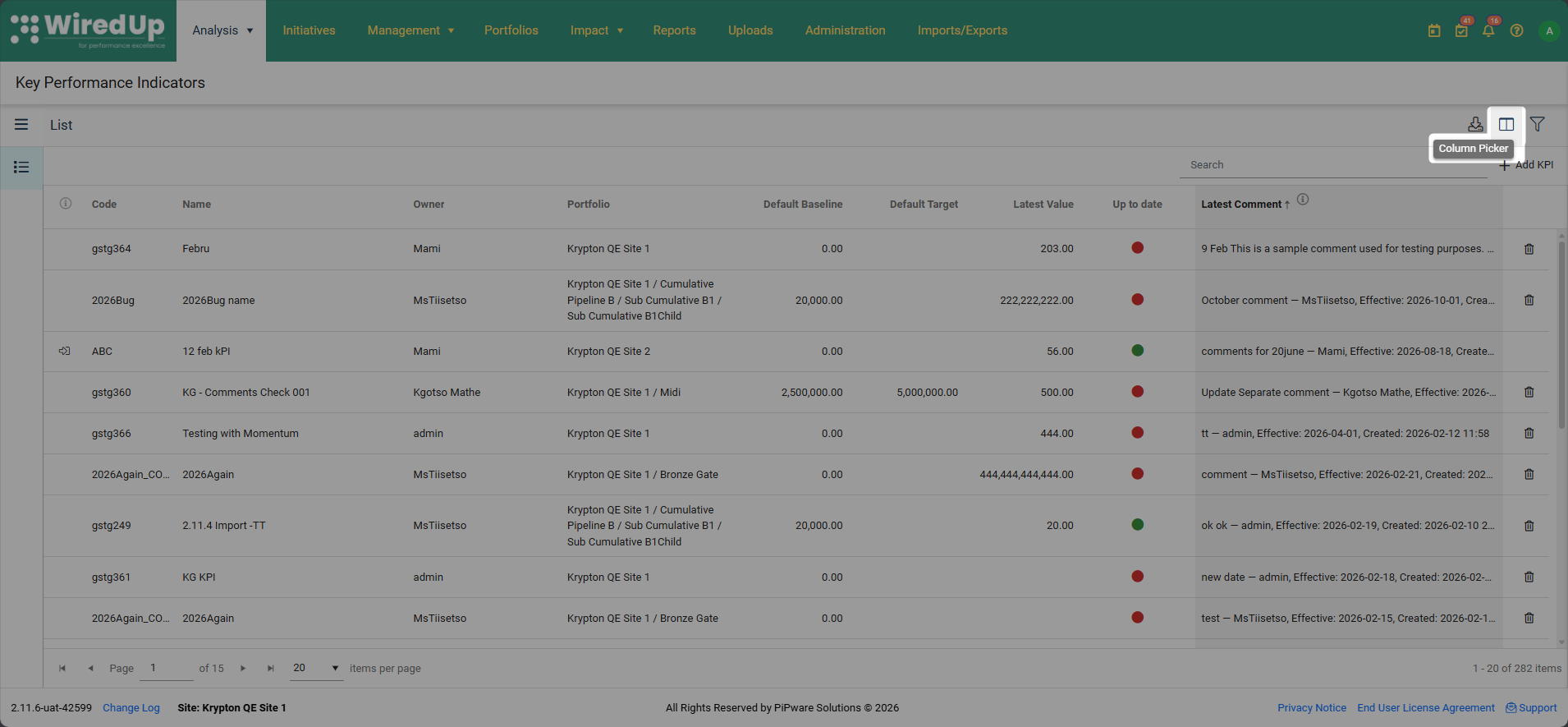 La columna Último comentario proporciona una vista general de los comentarios recientes directamente en la lista de KPI, lo que permite a los usuarios identificar rápidamente qué KPI tienen comentarios recientes sin tener que abrir cada KPI individualmente.