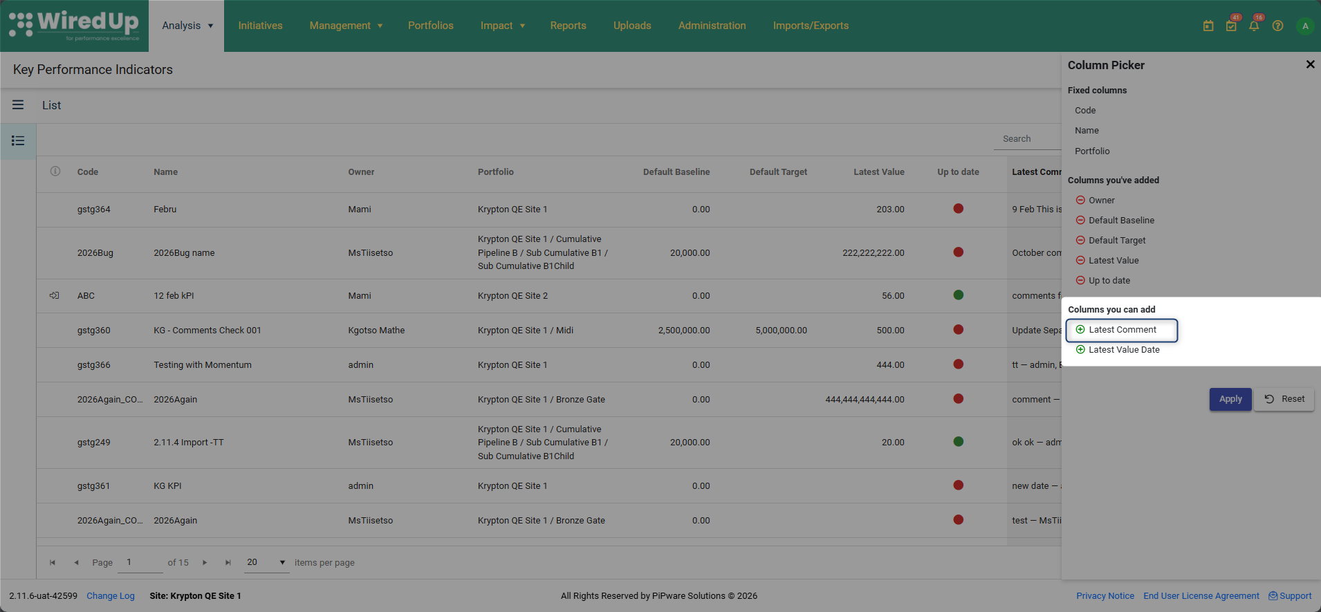 - Haga clic en Aplicar para guardar los cambios y la columna Último comentario aparecerá en la lista de KPI.